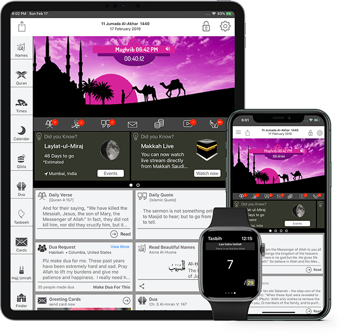 Quran, Prayer Times, Qibla Compass, 99 Names of Allah, Dua, Ramadan time table, Greeting cards, Zakat Calculator, Tasbih Counter, Hajj Guide and more. Free download at: